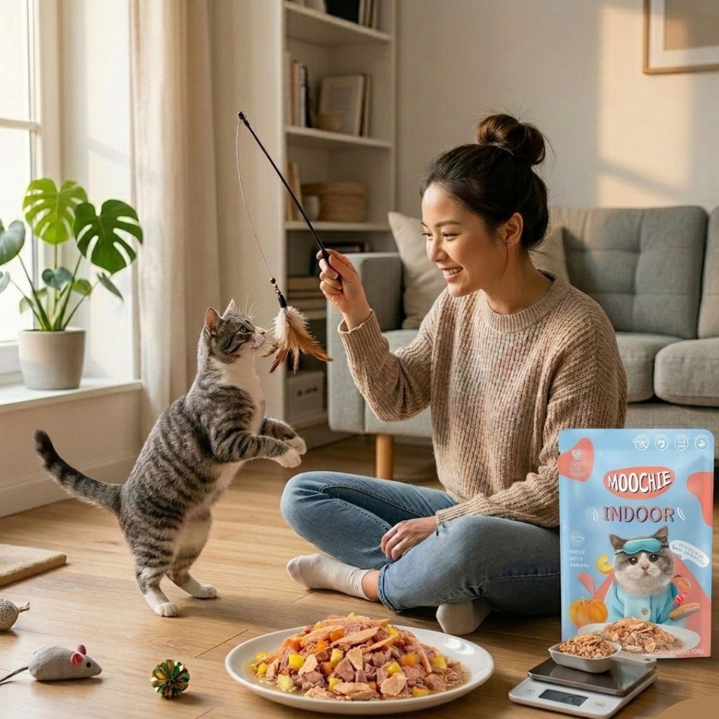 Even indoor cats can move more with the right encouragement. Wand toys, chase toys, cat trees, or short play sessions two to three times a day can all help support healthy weight balance.