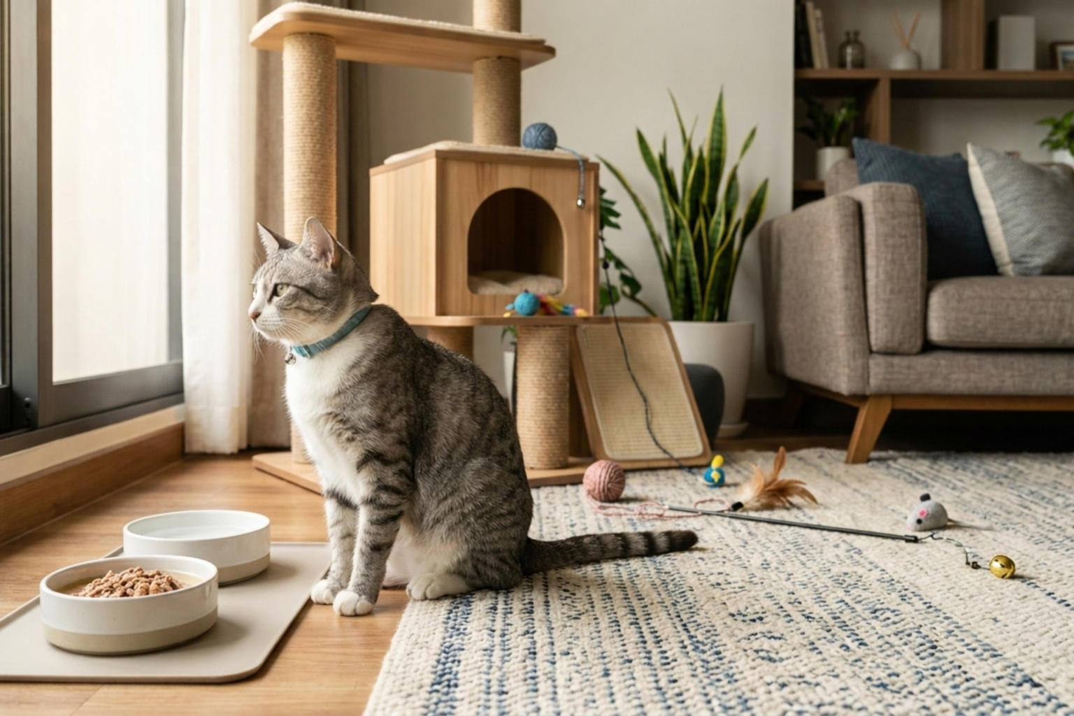 แมวเลี้ยงในบ้านหรือแมวคอนโด มักมีการเคลื่อนไหวไม่มากนัก จึงมีโอกาสน้ำหนักขึ้นง่าย และอาจเบื่อสิ่งแวดล้อมได้หากกิจกรรมในแต่ละวันค่อนข้างจำกัด