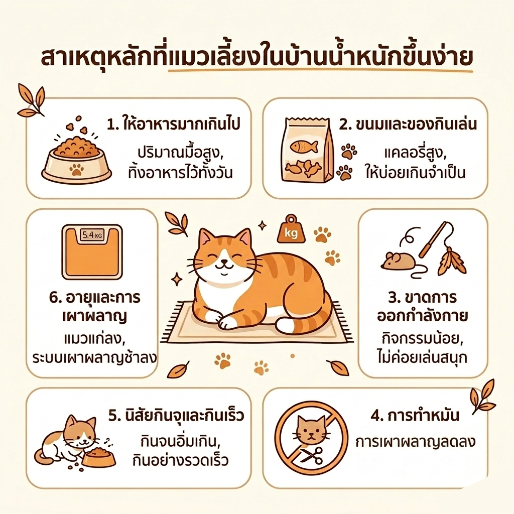 แมวเลี้ยงในบ้านจำนวนไม่น้อยใช้เวลาส่วนใหญ่ไปกับการนอน กิน และพักผ่อน หากมีกิจกรรมระหว่างวันน้อย แต่ยังได้รับอาหารในปริมาณเท่าเดิมทุกวัน น้ำหนักก็อาจค่อย ๆ เพิ่มขึ้นทีละนิด จนเริ่มส่งผลต่อความคล่องตัวและสุขภาพโดยรวมในระยะยาว