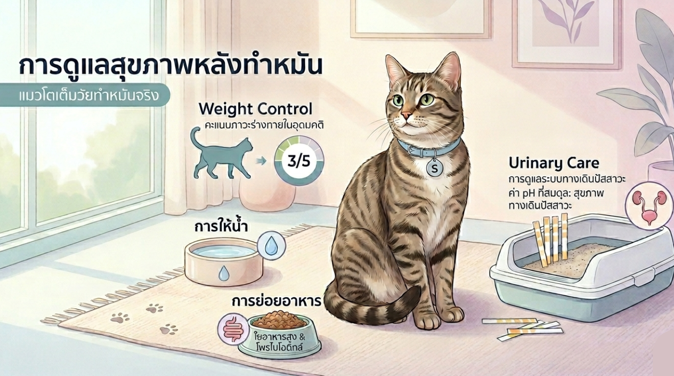 จึงไม่ใช่แค่ “ทำหมันแล้วจบ” แต่เจ้าของควรปรับการดูแลให้สอดคล้องกับไลฟ์สไตล์ใหม่ของแมวด้วย โดยเฉพาะเรื่องอาหาร การให้ปริมาณที่เหมาะสม และการติดตามน้ำหนักอย่างสม่ำเสมอ