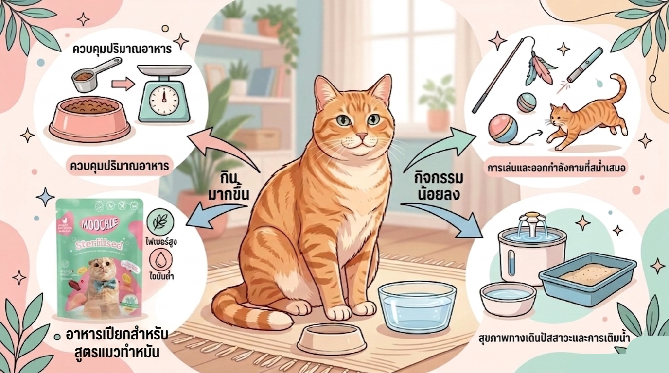 หลังทำหมัน ร่างกายของแมวจะมีการเปลี่ยนแปลงทั้งด้านฮอร์โมนและพฤติกรรม ซึ่งมักส่งผลต่อการใช้พลังงานในแต่ละวัน แมวบางตัวอาจมีแนวโน้ม